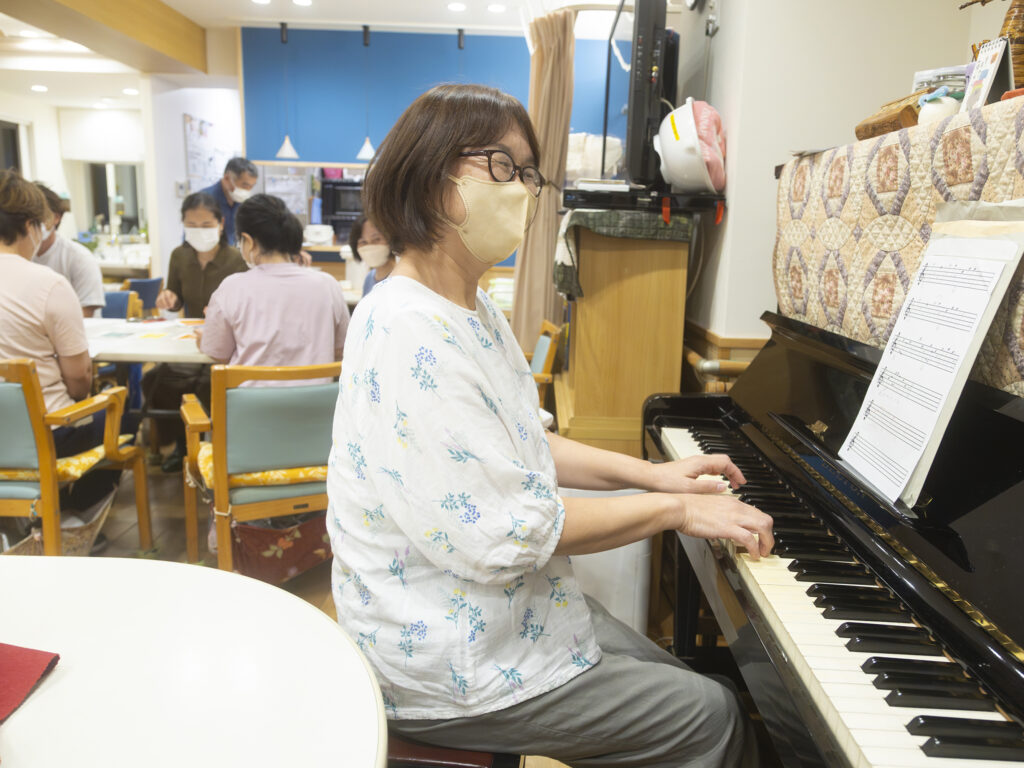 SKANKが制作した楽譜をもとに、職員がアレンジしたメロディーをピアノで演奏する職員・守屋真実。写真左奥では、そのメロディーを聴きながら、職員たちがカードを使って歌づくりを楽しんでいる。
