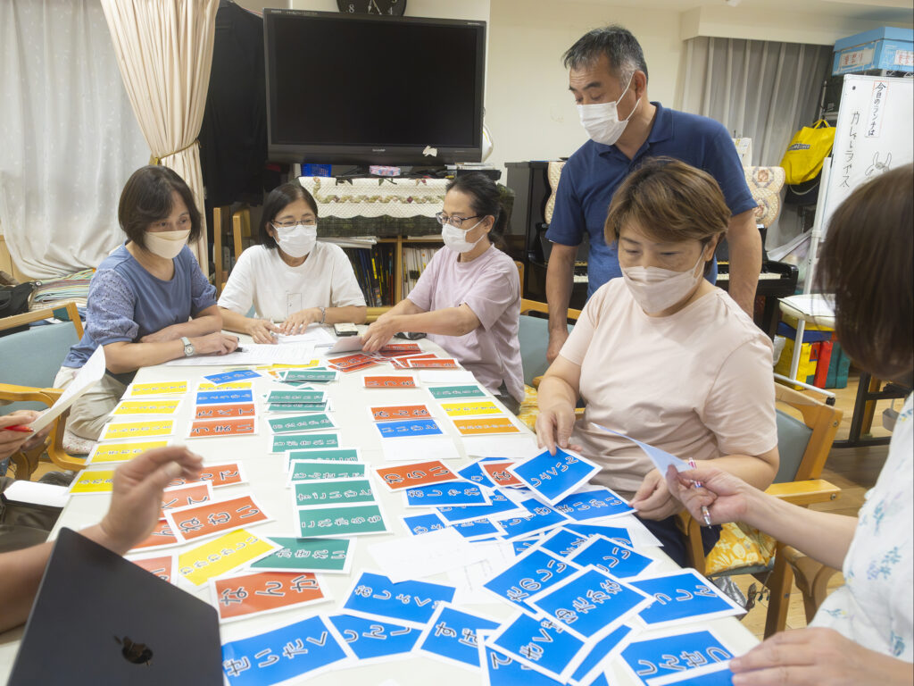そして次の9月22日には、見やすさや親しみやすさを重視した試作のカードを用いて、職員が実際に歌づくりに挑戦した。SKANKが考案した「言葉を並び替えるだけでメロディーが出来上がるカード」という仕組みを通じて職員の創作意欲を後押しし、10番までの歌が誕生した。