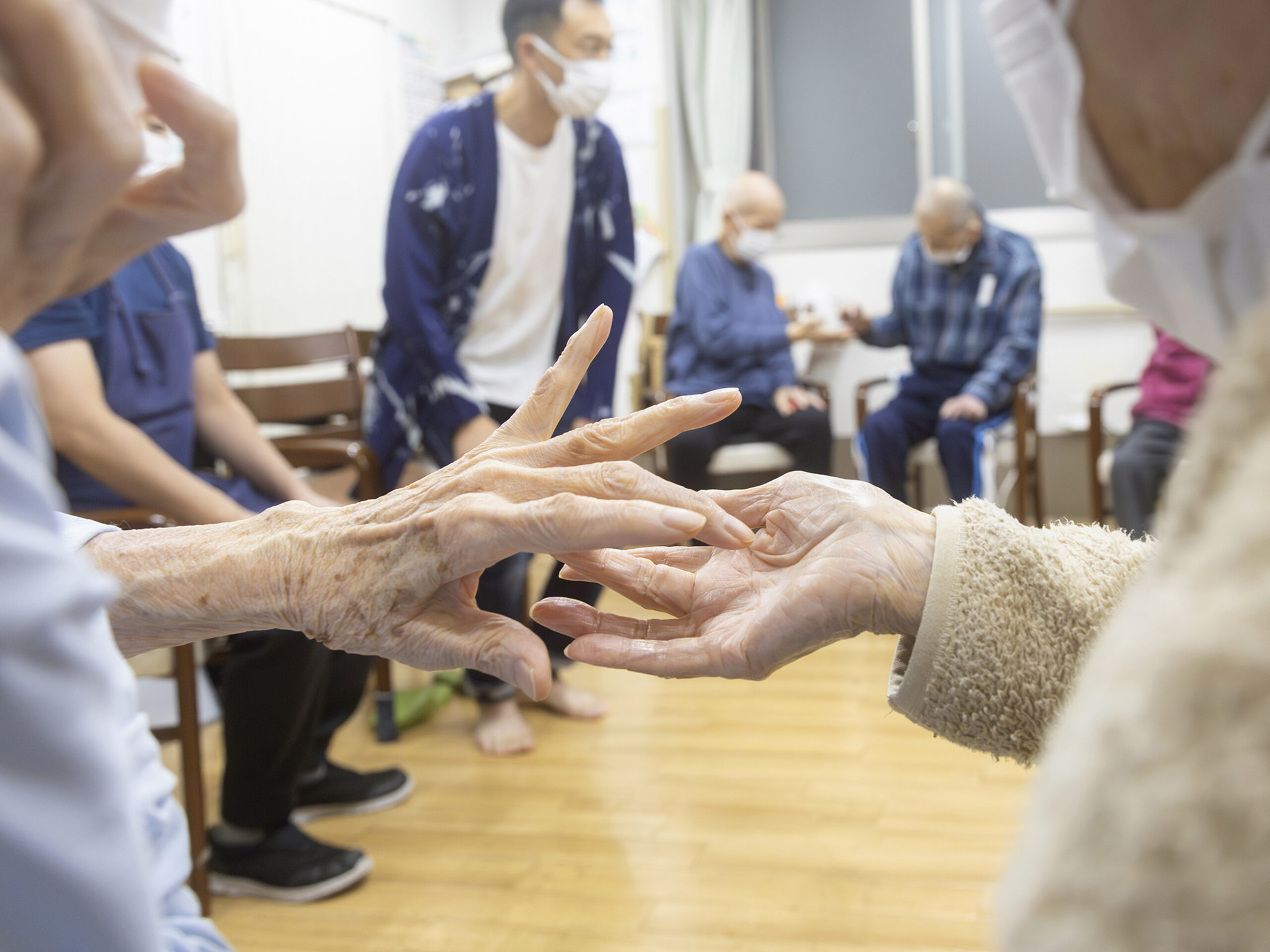ペアになり、つかず離れずの距離を保ちながら「手の会話」を楽しむ利用者2名。どのような表現をするか後ろから見守る館長。