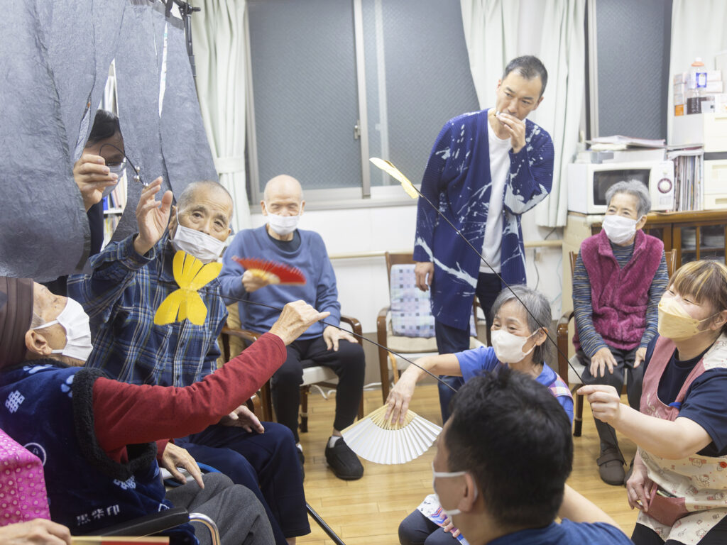 二人の利用者が「手の会話」を始めると、暖簾の奥から館長の八木が鈴を鳴らし、職員が差金を用いて蝶を飛ばした。音や動き、間合いでの会話が盛り上がると、みんなでの踊りが少しずつ立ち上がっていった。ハーモニカの音や扇子の風とともに、利用者と職員が一体となって舞う風景を参加者は動きながら堪能した。