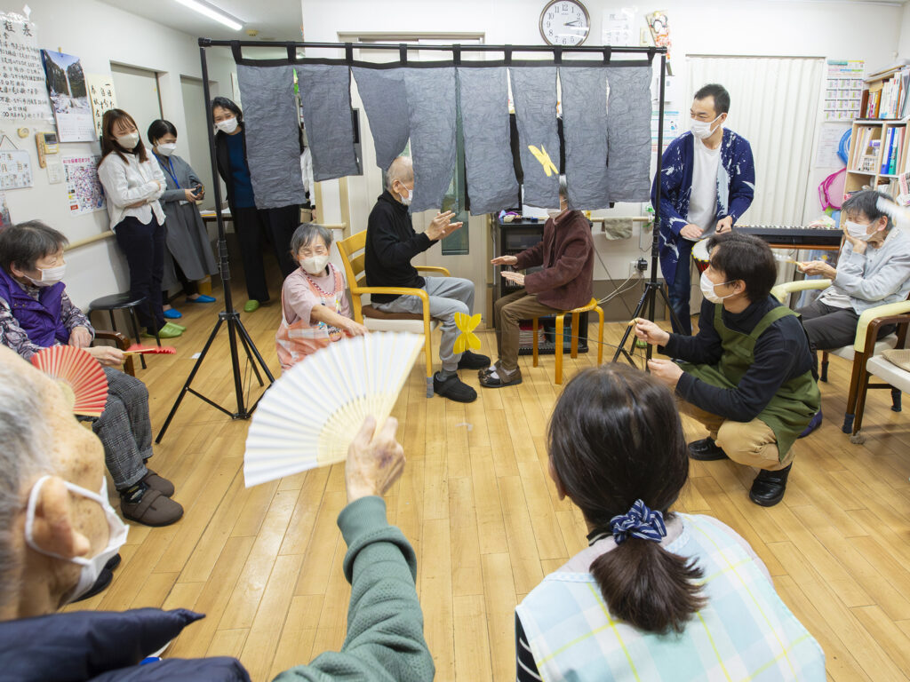 暖簾の奥で、利用者と大西が向き合い「手の会話」をし、職員や利用者は扇子を扇いで風を送ることで合の手を入れた。太鼓を叩いて参加する利用者の姿も見られ、多様な関わり方が共創の場を生んでいた。