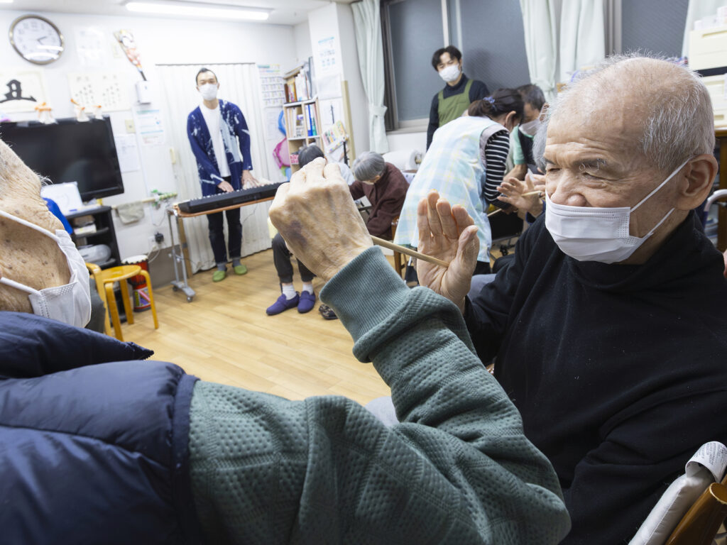 風船を取り入れた時の様子。ハーモニカや太鼓の生演奏も加わり、視覚が衰えている高齢者にとっても音の手がかりが生まれ、より取り組みやすい環境となった。